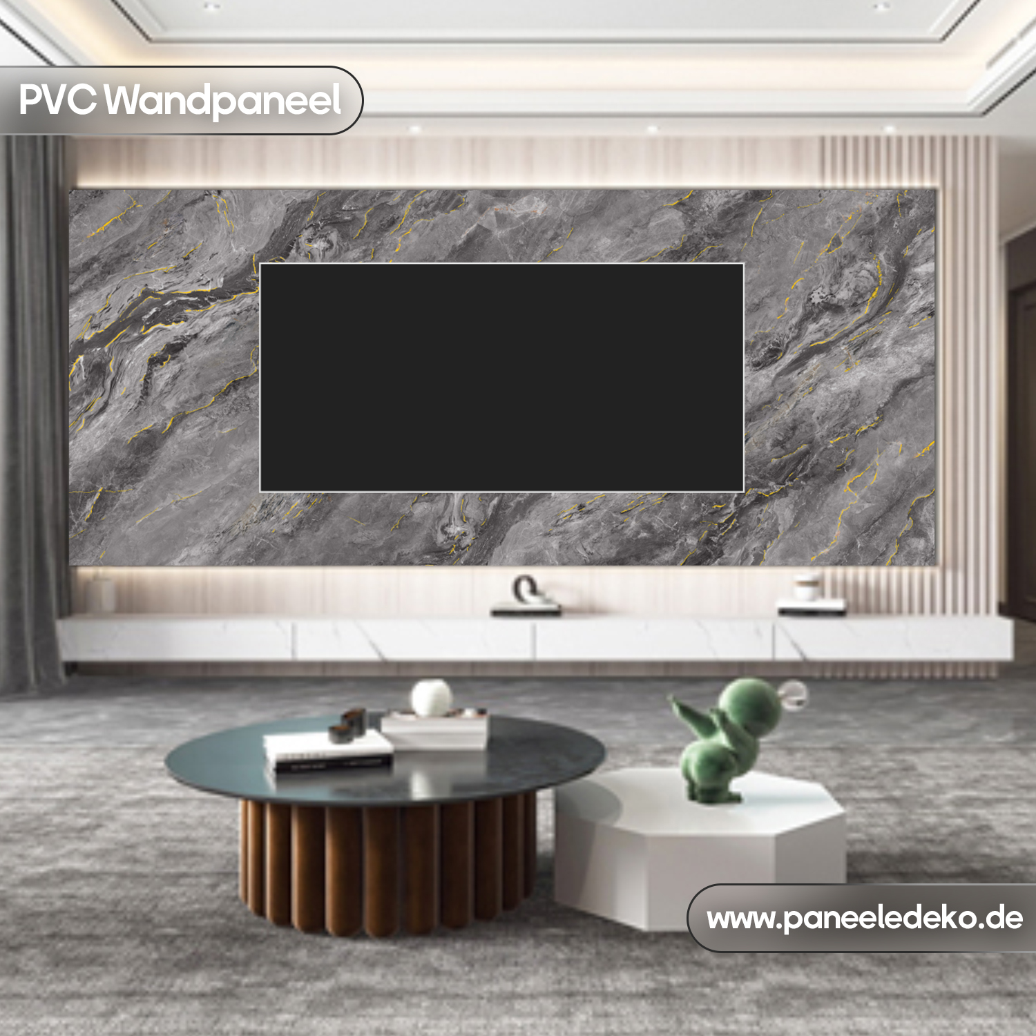Die Paneele Deko PVC-Wandpaneele in PVC-Marmorplatte – Grau mit Goldadern Hochglanz verwandeln Ihre Räume in ein modernes, elegantes und absolut pflegeleichtes Ambiente.