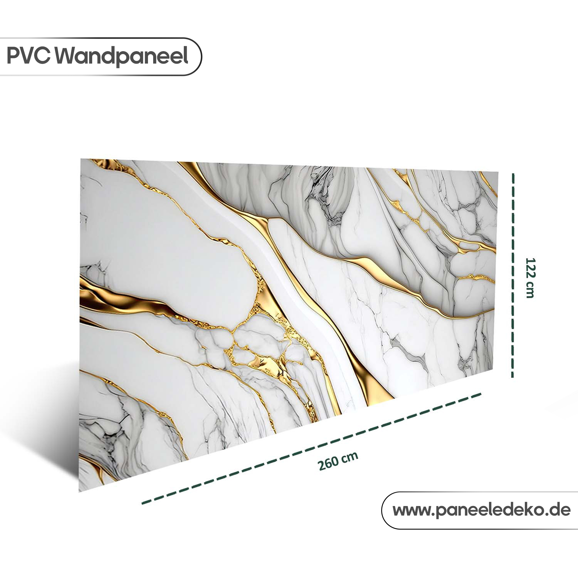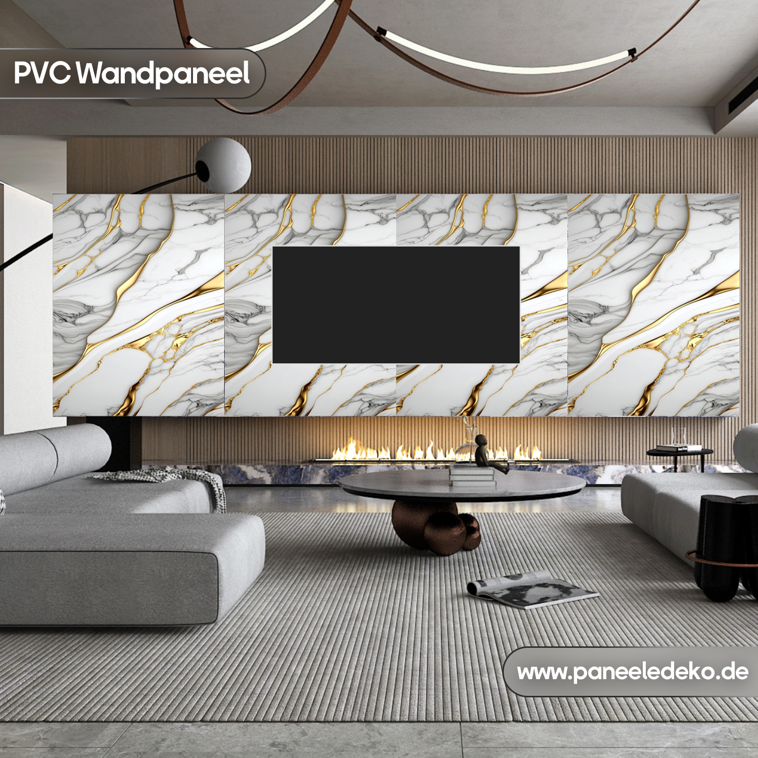 Mit Paneele Deko PVC-Marmorpaneel – Luxus-Gold-Flow Hochglanz holen Sie sich luxuriöse Marmor-Optik und praktische Alltagstauglichkeit in einem – stilvoll, glänzend und kinderleicht zu reinigen.