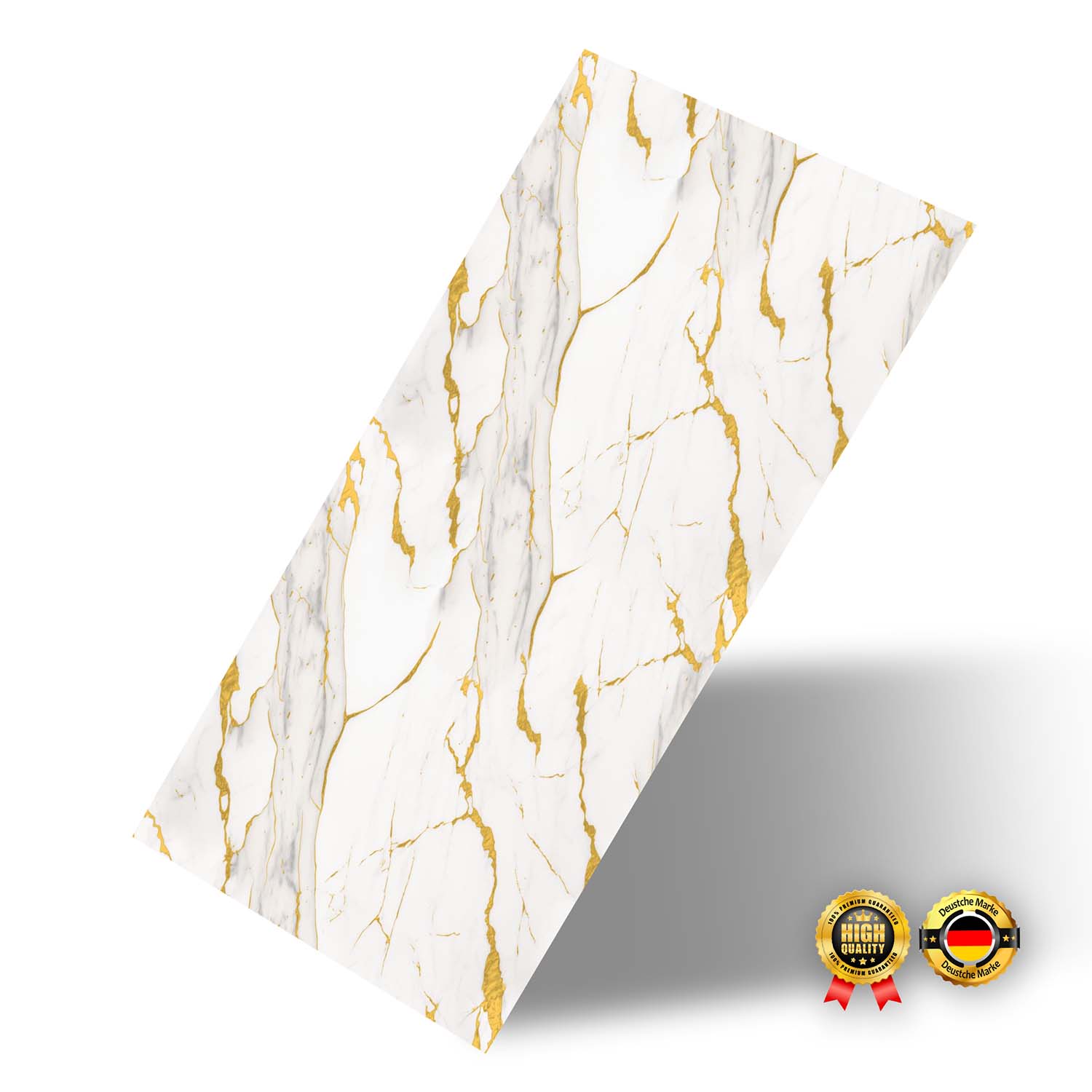 Die edle Schneewolken weiß-Optik mit warmen Goldadern und hochglänzendem Finish bringt königlichen Glanz und luxuriöse Wärme in jeden Raum.